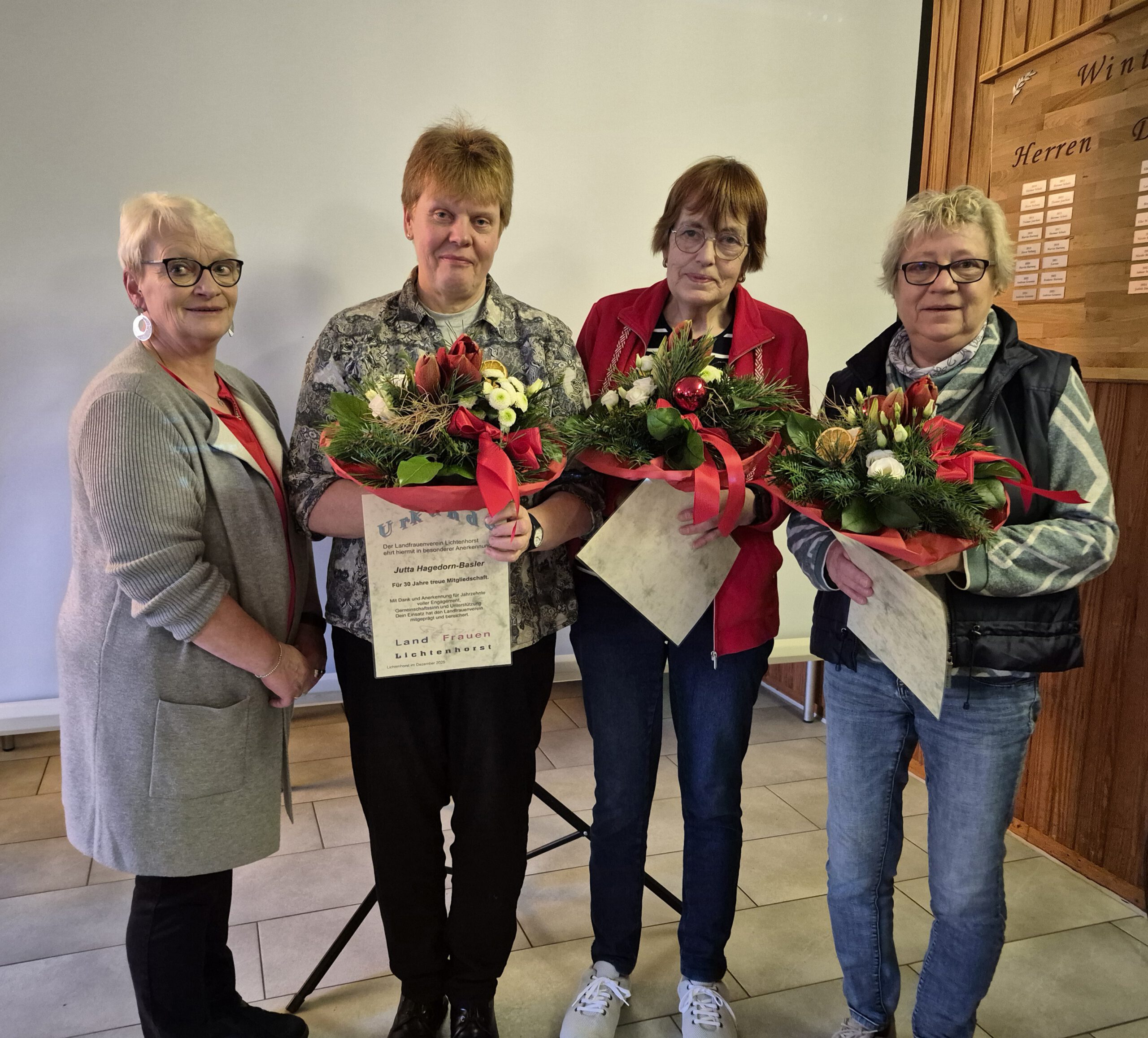 Ein besonderer Höhepunkt der Feier waren die Ehrungen langjähriger Mitglieder. Für zehn Jahre Mitgliedschaft wurde Brunhilde Wiesner ausgezeichnet, auf 30 Jahre blickt Marga Hogreve und Jutta Hagedorn-Basler zurück. Eine ganz besondere Ehrung galt Anneliese Malek für 50 Jahre Treue zu den Landfrauen. Frau Malek konnte an diesem Nachmittag leider nicht persönlich anwesend sein. Die Urkunde sowie ein Blumenstrauß wurden ihr daher zu einem späteren Zeitpunkt von der Vorsitzenden Claudia Hogreve gemeinsam mit Ingrid Lange überreicht.