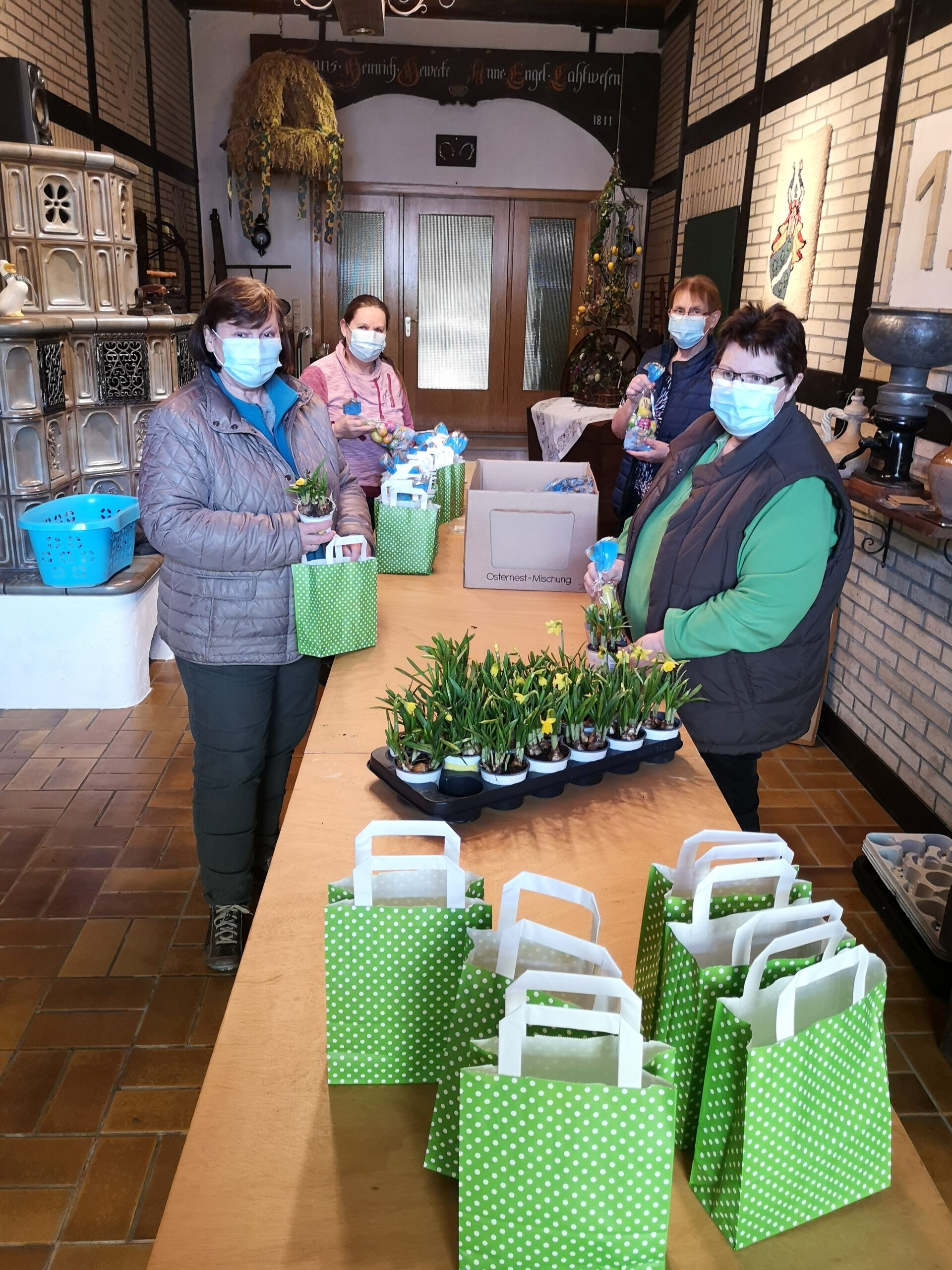 Im März machten sich die Ortsvertrauensfrauen aus allen Wunstorfer Ortsteilen auf den Weg, um die Mitglieder des Vereins mit einer bunten Frühlingstüte zu überraschen. Im Vorfeld wurden die Tüten in Kolenfeld bei der 2. Vorsitzenden gepackt. Einige helfende Hände waren parat, so dass die Arbeitzügig erledigt war. Die vom Landesverband gestellten Grußkarten wurden von jedem Ortsverein individuell gestaltet und mit einem aufmunternden Frühlingsgruß versehen. Neben einen Topf mit Osterglocken enthielt die Tüte noch süße Leckereien. Die Beschenkten waren erfreut, wieder etwas von den LandFrauen zuhören, da die meisten Veranstaltungen wegen den bestehenden Auflagen ausfallen mussten. Auch die noch ausstehenden Termine können leider nicht stattfinden. Der Vorstand hofft, dass in der neuen Saison die Termine nachgeholt werden können und wünscht allen Mitgliedern ein schönesOsterfest und eine möglichst normale Zeit bis zum Wiedersehen.