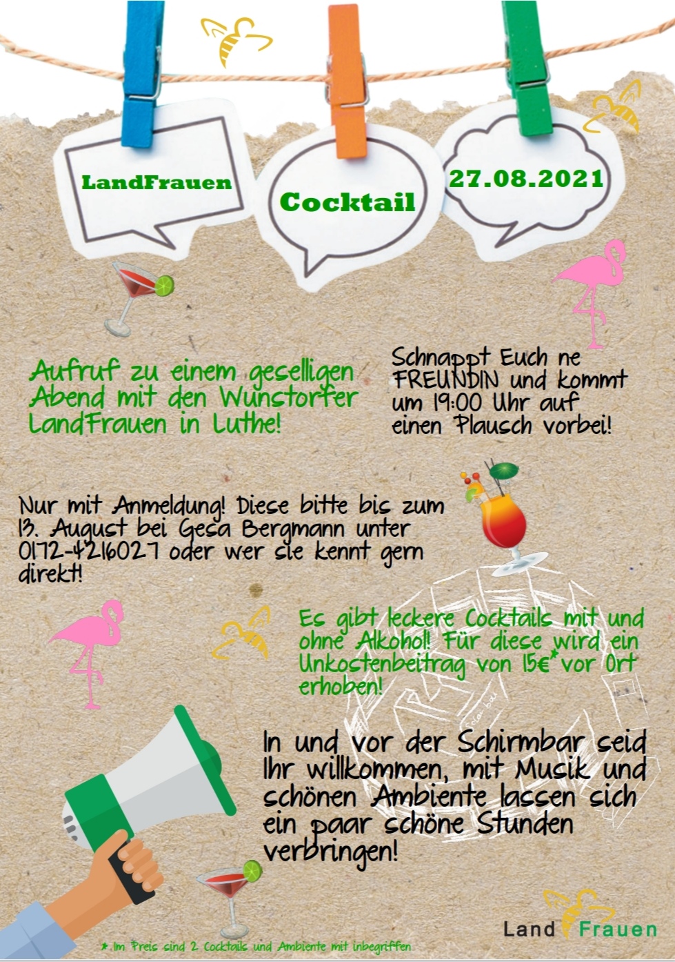 Die erste Veranstaltung des neuen Programms ist sehr gut gelaufen. Mit 80 Frauen, teils Mitglieder teils Gäste, startete der Cocktailabend. Im schönen Ambiente bei „Stille am See“ und in der „Schirmbar Hannover.de“, ließen sich alle die Cocktails schmecken! Die beiden Barkeeper mixten gekonnt und souverän alkoholische sowie nicht alkoholische Cocktails. In der Urlaubsfeeling bringenden Deko waren alle Teilnehmerinnen froh sich mal wieder zu treffen. Um sich auszutauschen und den Gästen  die LandFrauen näher zu bringen.