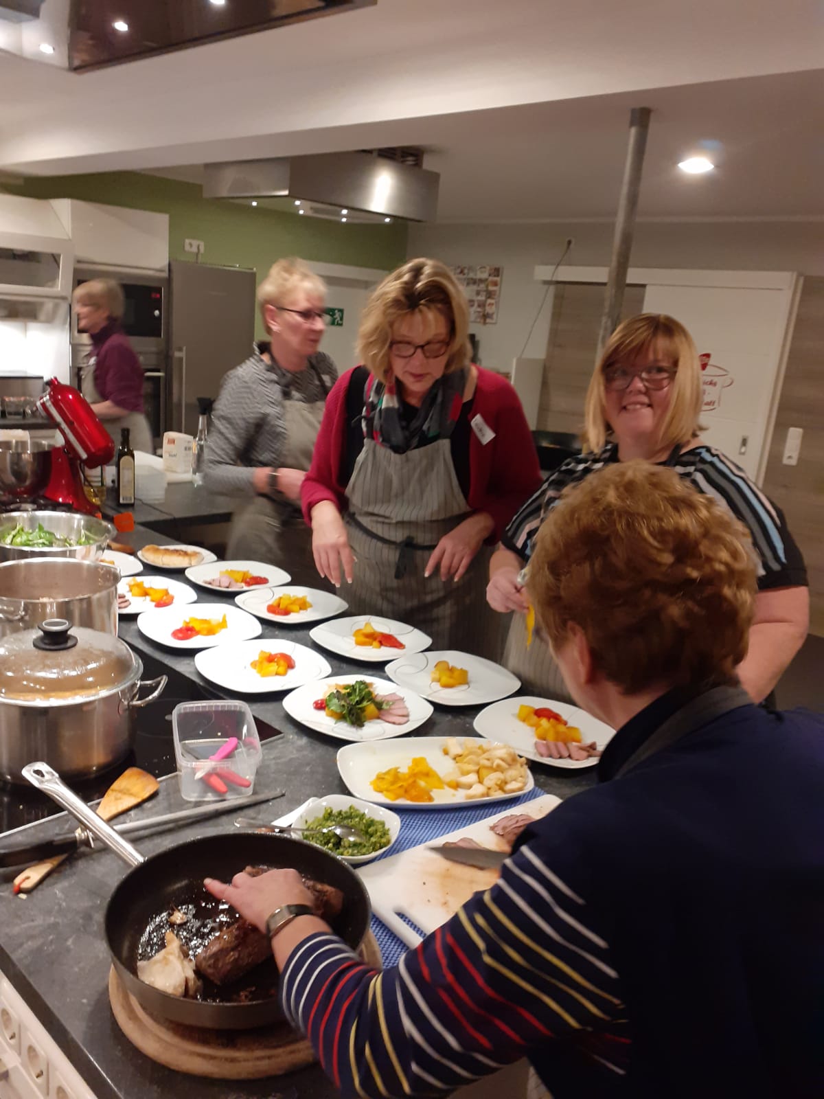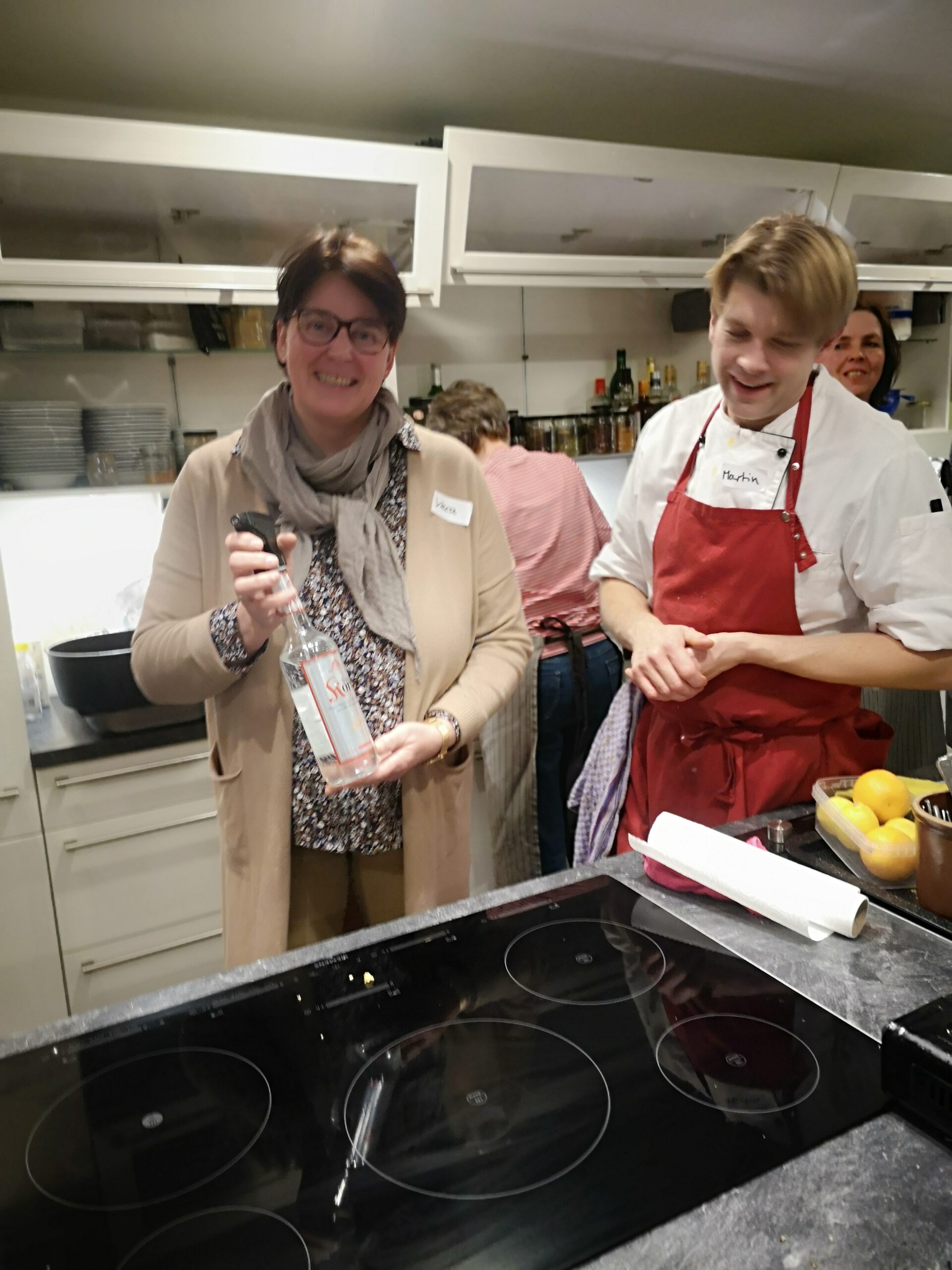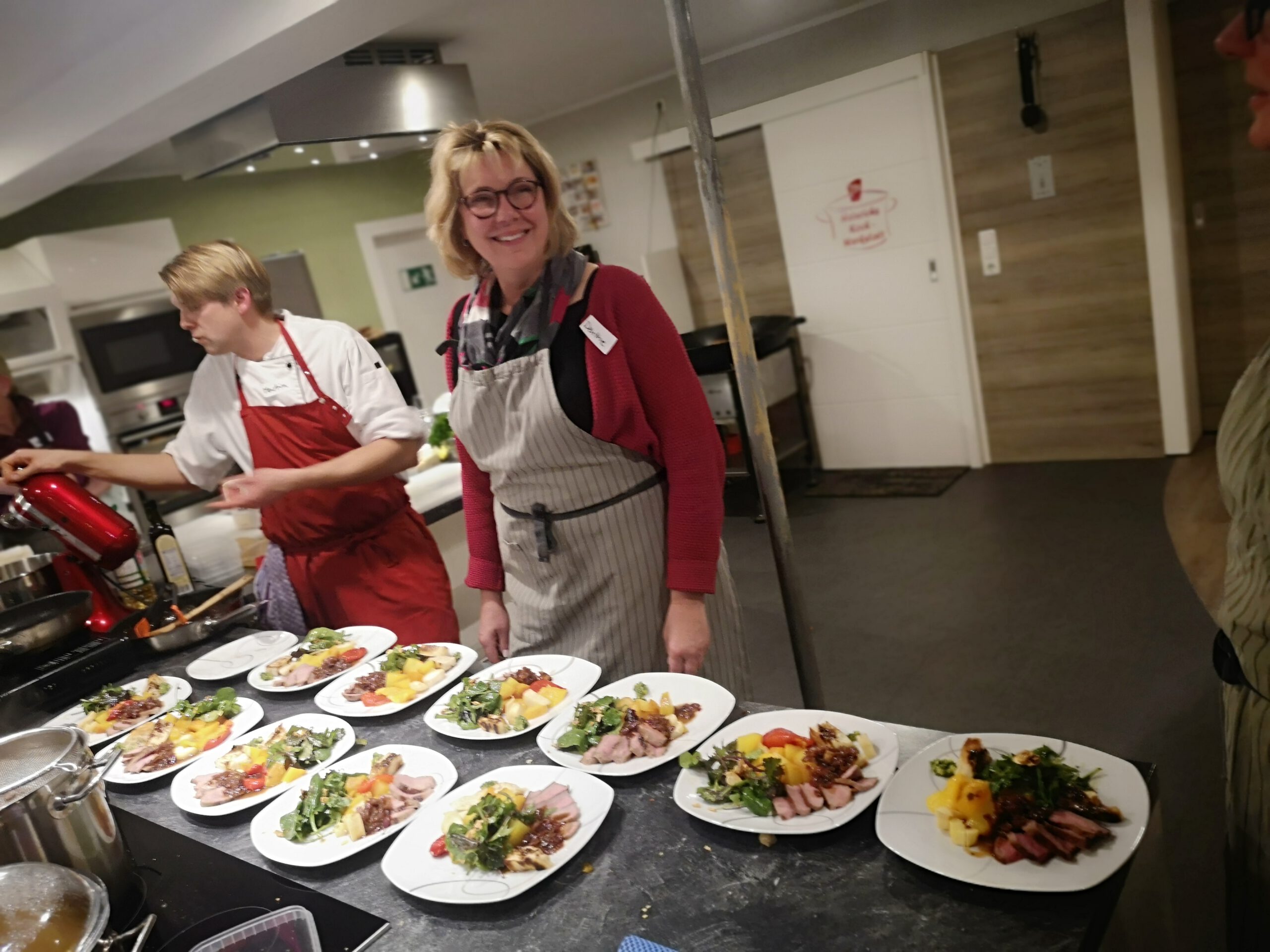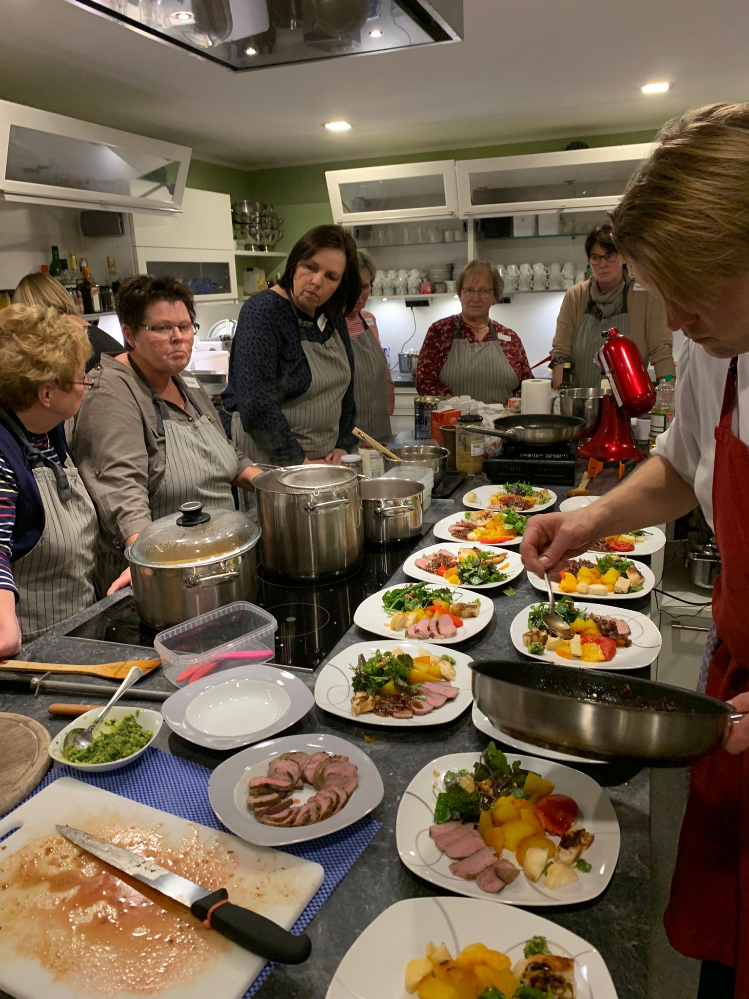 10 LandFrauen machten sich auf die Reise nach Lüdersfeld zum „Dicken Heinrich“, um zusammen mit dem Juniorchef Martin Parno Wild zu kochen. Mit Schürzen und Messern bewaffnet, ging es auch gleich mit dem schnippeln und parieren los. Pfannenbrot und Gewürzbutter machten den Start, mit Salat, Wildschweinrücken und gelber Beete ging es weiter. Da Suppe immer geht, war es bei uns Petersilienwurzelsuppe mit Pesto. Als Hauptgang gab es allerlei, allerdings nicht aus Leipzig! 🙂 Rehgulasch und Rehfilet mit Kartoffelklößen, Rotkohl, Spitzkohl und gebratener Polenta. Last but not least gab es zum Dessert ein Mangosorbet. Wein, Wasser, Kaffee und was man noch so wollte, waren natürlich den ganzen Abend unsere Begleiter. Und passend zu unserem Thema Wild kochen, spielten die Jagdhornbläser im Saal neben an.