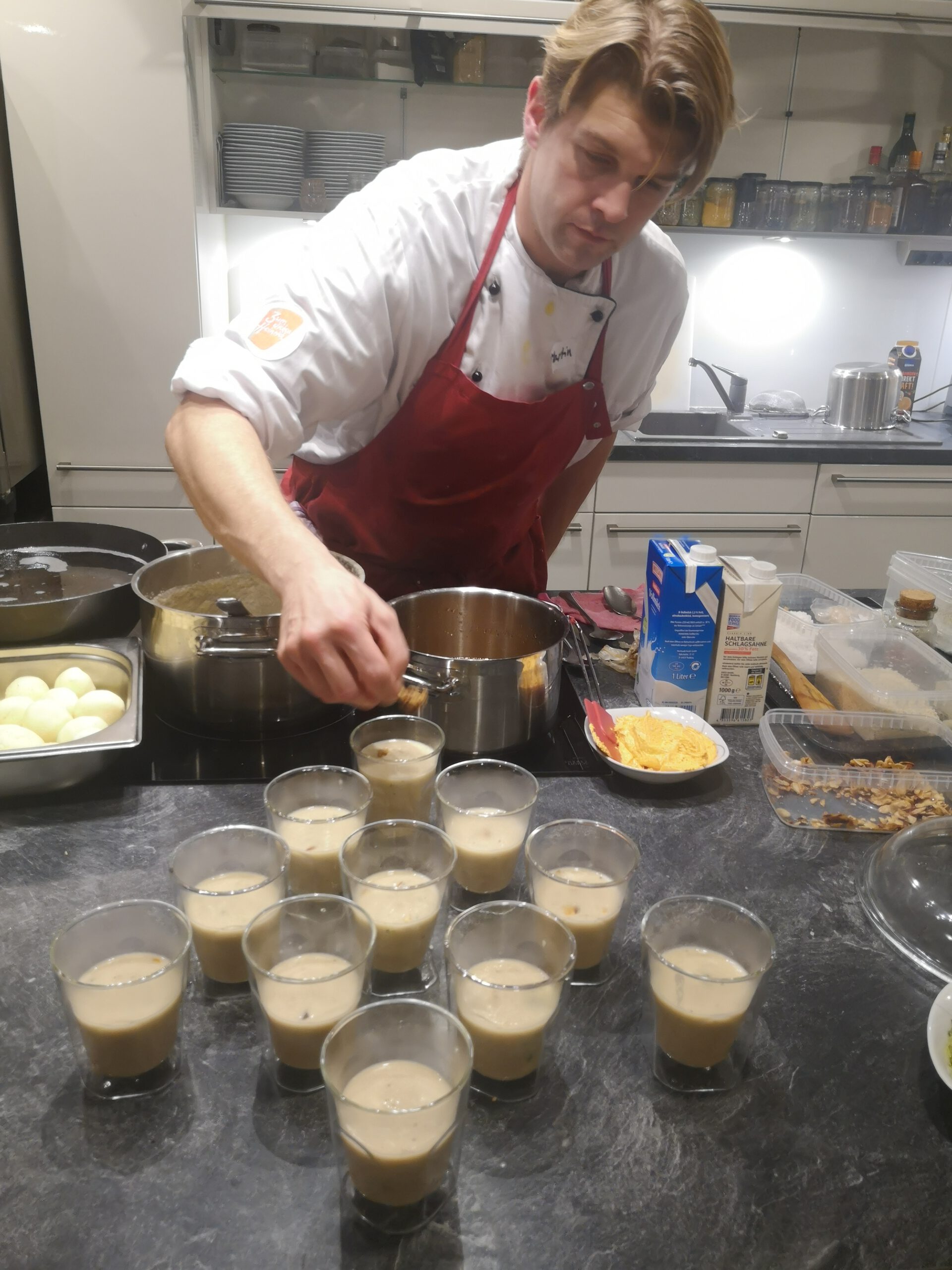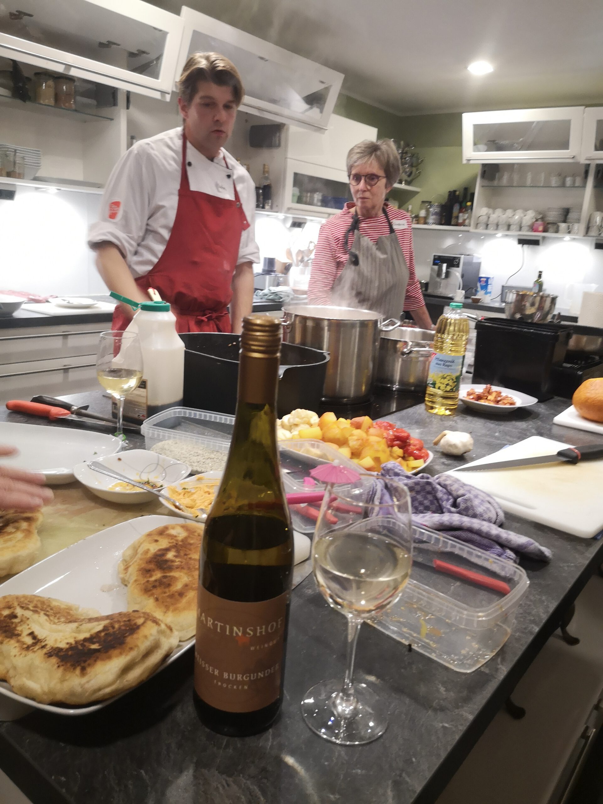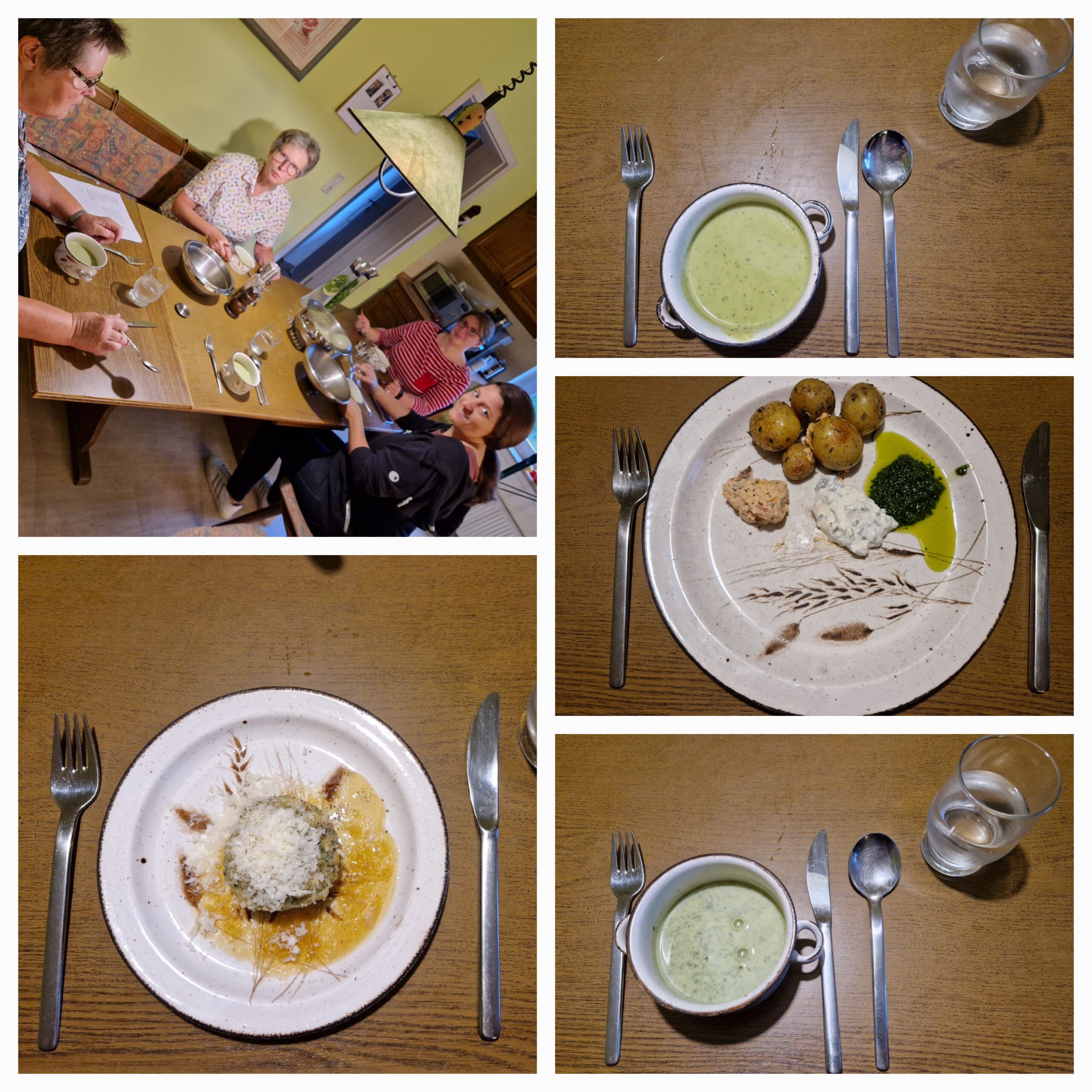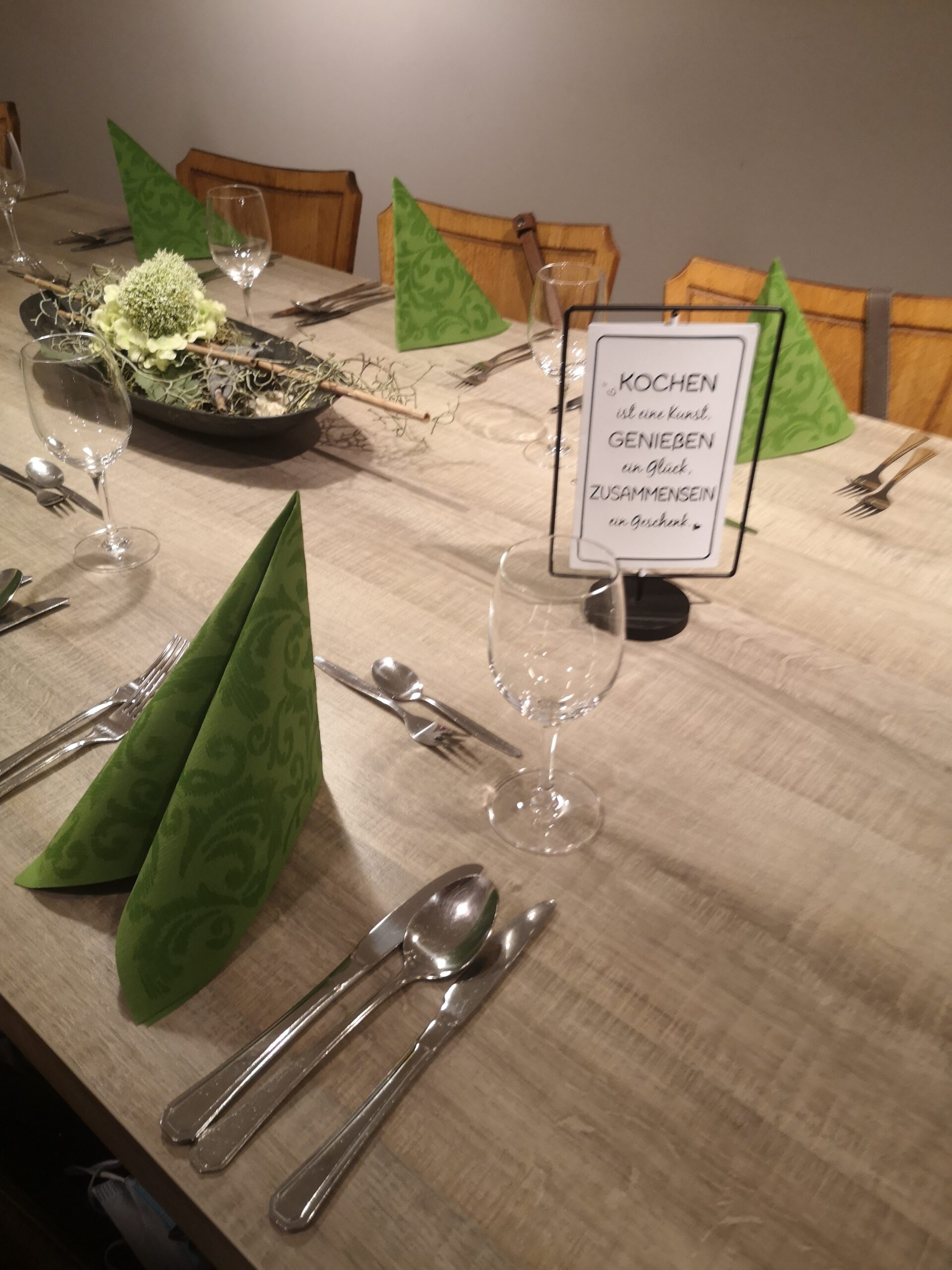 10 LandFrauen machten sich auf die Reise nach Lüdersfeld zum „Dicken Heinrich“, um zusammen mit dem Juniorchef Martin Parno Wild zu kochen. Mit Schürzen und Messern bewaffnet, ging es auch gleich mit dem schnippeln und parieren los. Pfannenbrot und Gewürzbutter machten den Start, mit Salat, Wildschweinrücken und gelber Beete ging es weiter. Da Suppe immer geht, war es bei uns Petersilienwurzelsuppe mit Pesto. Als Hauptgang gab es allerlei, allerdings nicht aus Leipzig! 🙂 Rehgulasch und Rehfilet mit Kartoffelklößen, Rotkohl, Spitzkohl und gebratener Polenta. Last but not least gab es zum Dessert ein Mangosorbet. Wein, Wasser, Kaffee und was man noch so wollte, waren natürlich den ganzen Abend unsere Begleiter. Und passend zu unserem Thema Wild kochen, spielten die Jagdhornbläser im Saal neben an.