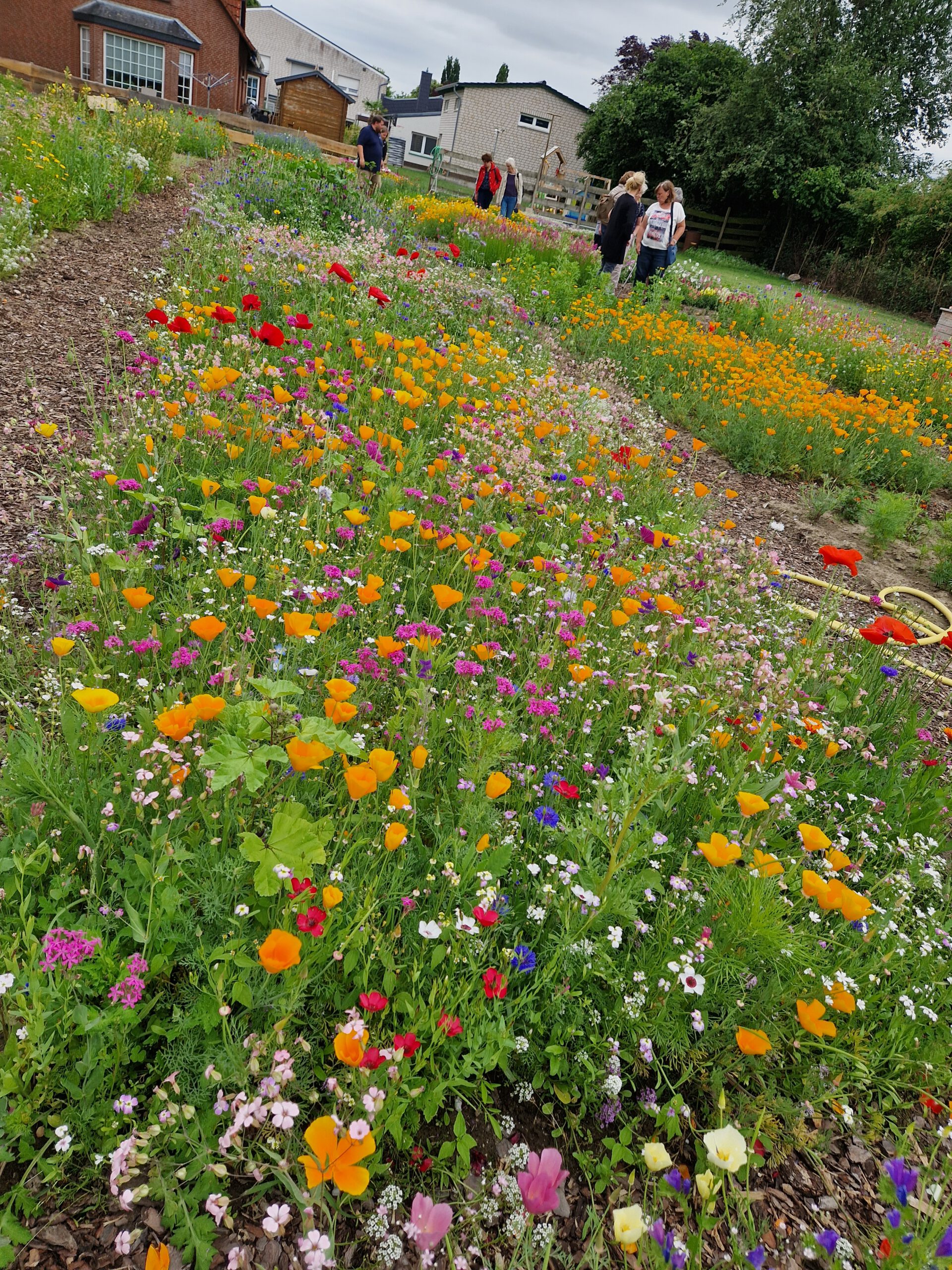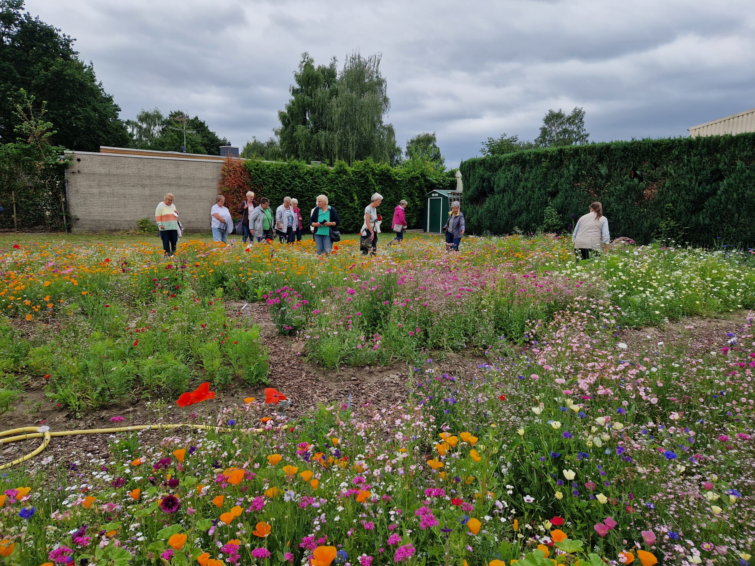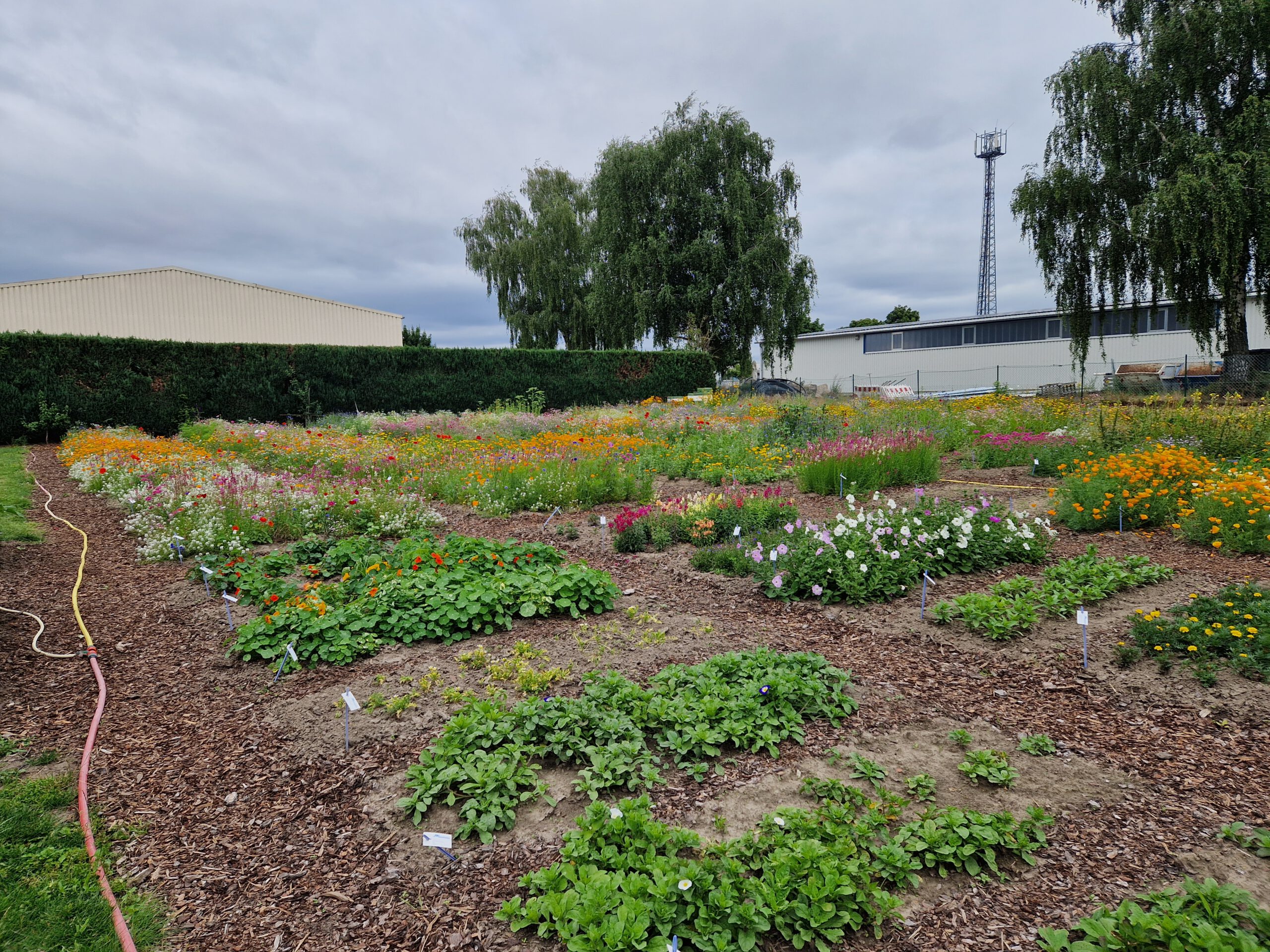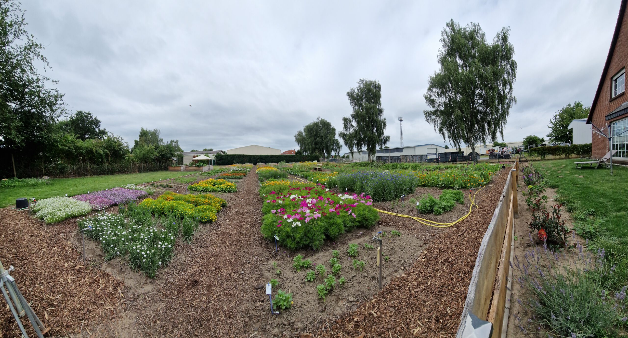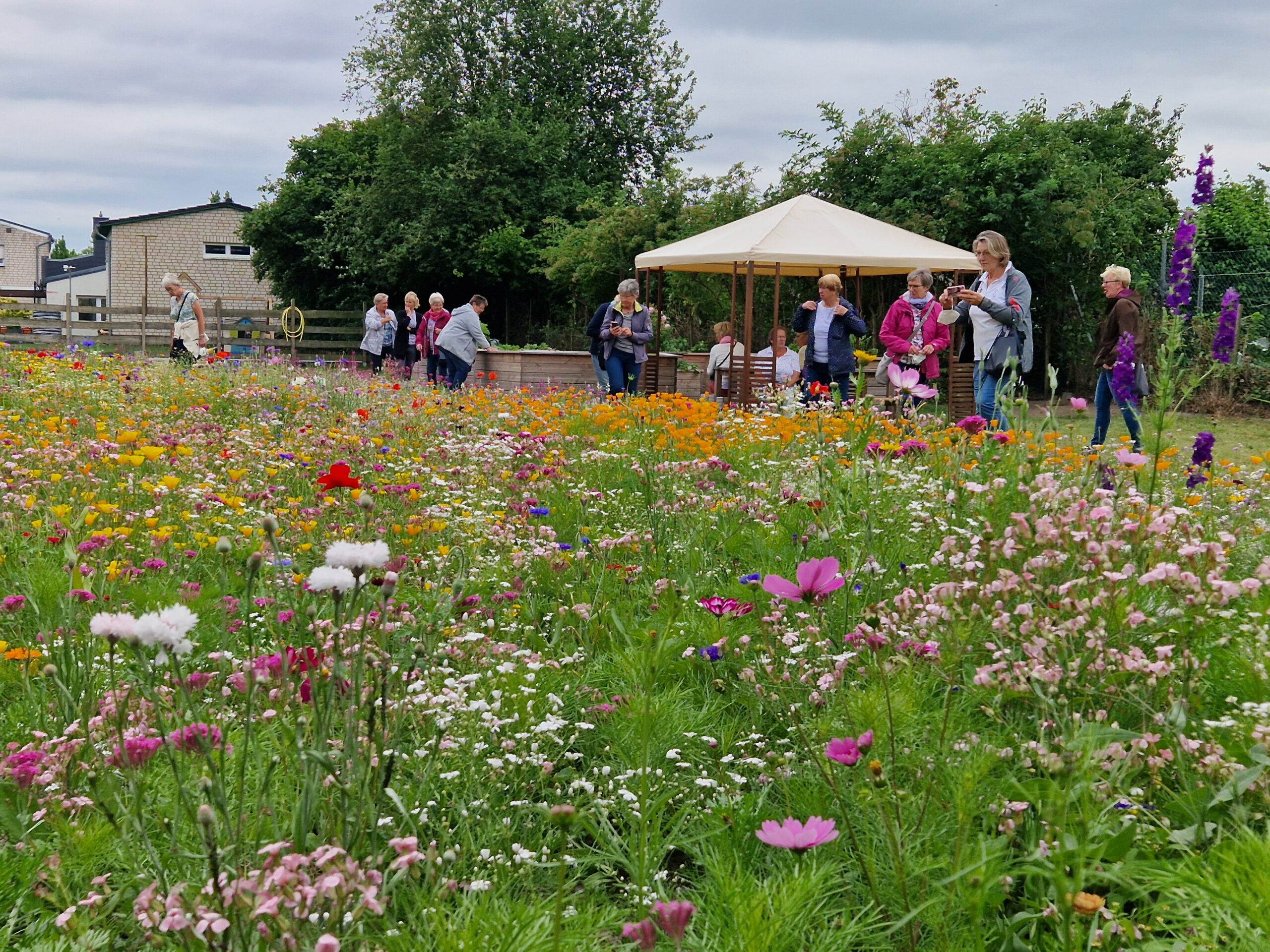 Nach der Theorie konnten sich die LandFrauen die Versuchsfelder ansehen. Alle waren überrascht über die Größe und Vielfalt der Anlage. Hier gab es Beete mit Blumenmischungen nach Farbe und Höhe  angelegt. Aber auch einzelne Sorten von Pflanzen wurden zur Kontrolle ausgesät, um zu überprüfen, ob die Farbangaben bei der Lieferung stimmten, z. B. rein weiß, rein  gelb usw. Auch die Höhe der Pflanzen und ungebetene Beimischungen können so erkannt und ev. beim Zulieferer reklamiert werden. Nach einer kleinen Erfrischung und vielen Fragen starteten die LandFrauen zu ihrem zweiten Ziel.
