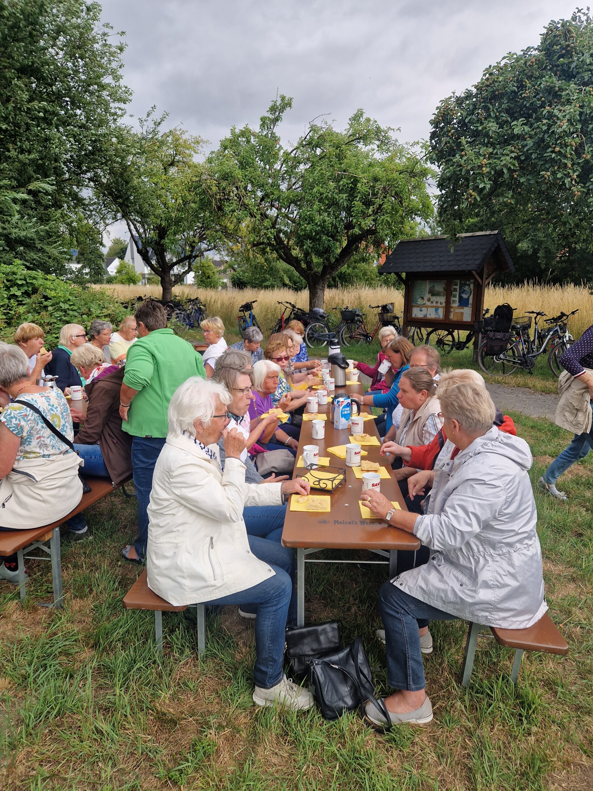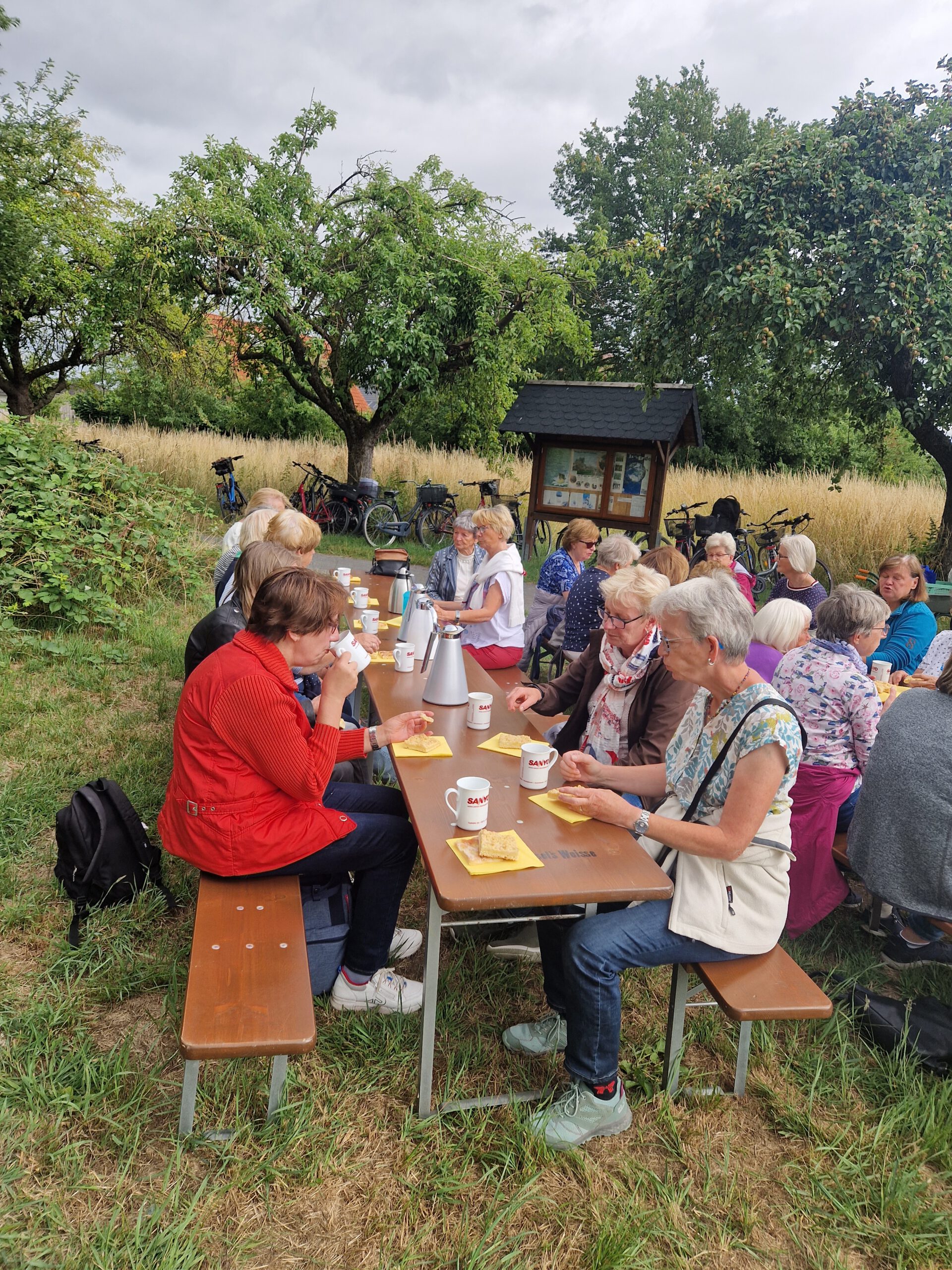 Nach so viel Informationen und Eindrücke hatten sich die LandFrauen im Anschluss eine Kaffeepause verdient. Bei selbstgebackenen Zucker- und Streuselkuchen schmeckte der Kaffee in der freien Natur besonders gut. Zum Abschluss überreichte Bärbel Bergmann dem Team für ihre Mühen einen kleinen Präsentkorb. Jeder Teilnehmer bekam noch ein Glas Honig mit auf den Weg. Danach machten sich die Frauen wieder auf den Weg nach Hause. Alle stimmten überein, daß es ein schöner Tag mit vielen Informationen und Anregungen war.