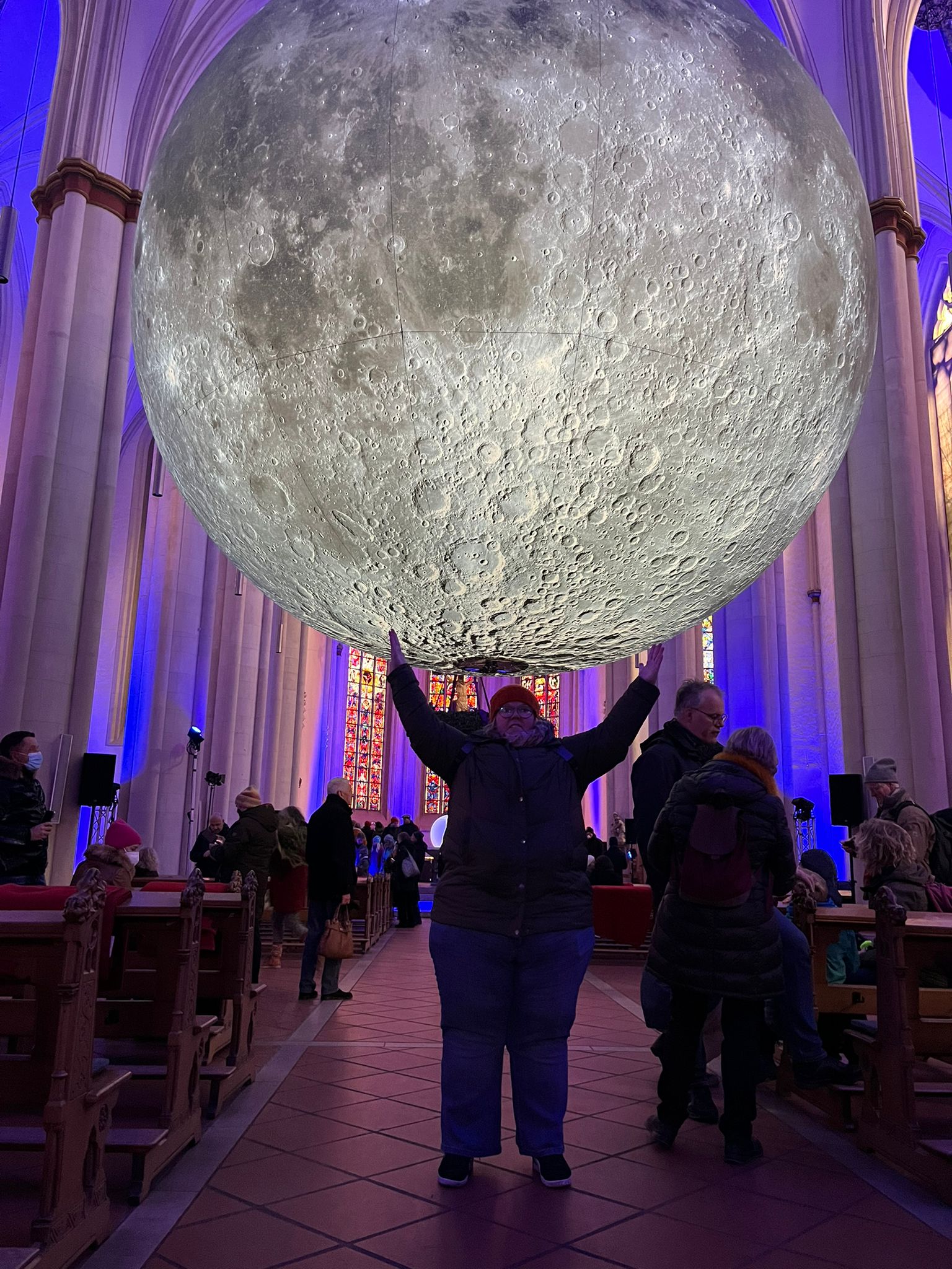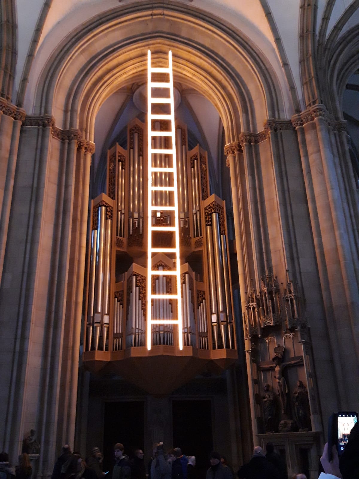 Nach dieser Stärkung ging es in kleinen Gruppen über die verschiedenen Weihnachtsmärkte. Bei sehr ansprechenden Ständen konnten die Frauen letzte Weihnachtsgeschenke und Aufmerksamkeiten besorgen. Selbstverständlich wurden auch die lokalen Spezialitäten und Getränke probiert. Bei einbrechender Dunkelheit sah man die ganze Schönheit der alten Giebelhäuser. Alle waren wunderbar geschmückt und beleuchtet. Es breitete sich ein ganz eigenes Flair aus. Besondere Attraktion war die Himmelsleiter an der Ludgeri – Kirche. Scheinbar ohne Halt führte sie direkt in den Himmel.
